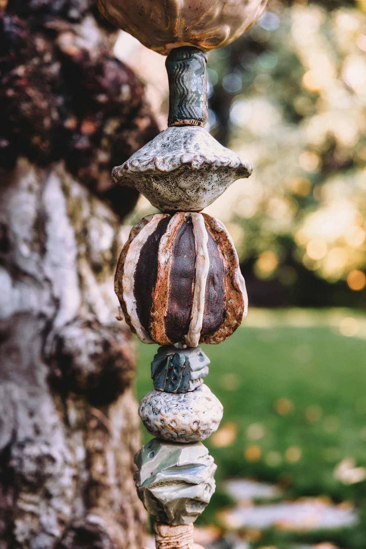 Stacked ceramic sculptures resembling seed pods with textured surfaces, arranged vertically against a neutral background.